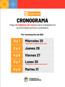 El jueves 26, será el turno de aquellos con DNI finalizados en 2 y 3. El viernes 27, los números 4 y 5. El cronograma de ejecución del pago del sueldo de marzo continuará el lunes 30, jornada de pago a los números 6 y 7. Este tramo estará disponible desde el sábado 28, a través de los cajeros habilitados por el Banco de Corrientes SA y el homebanking de cada caja sueldo de los agentes.
