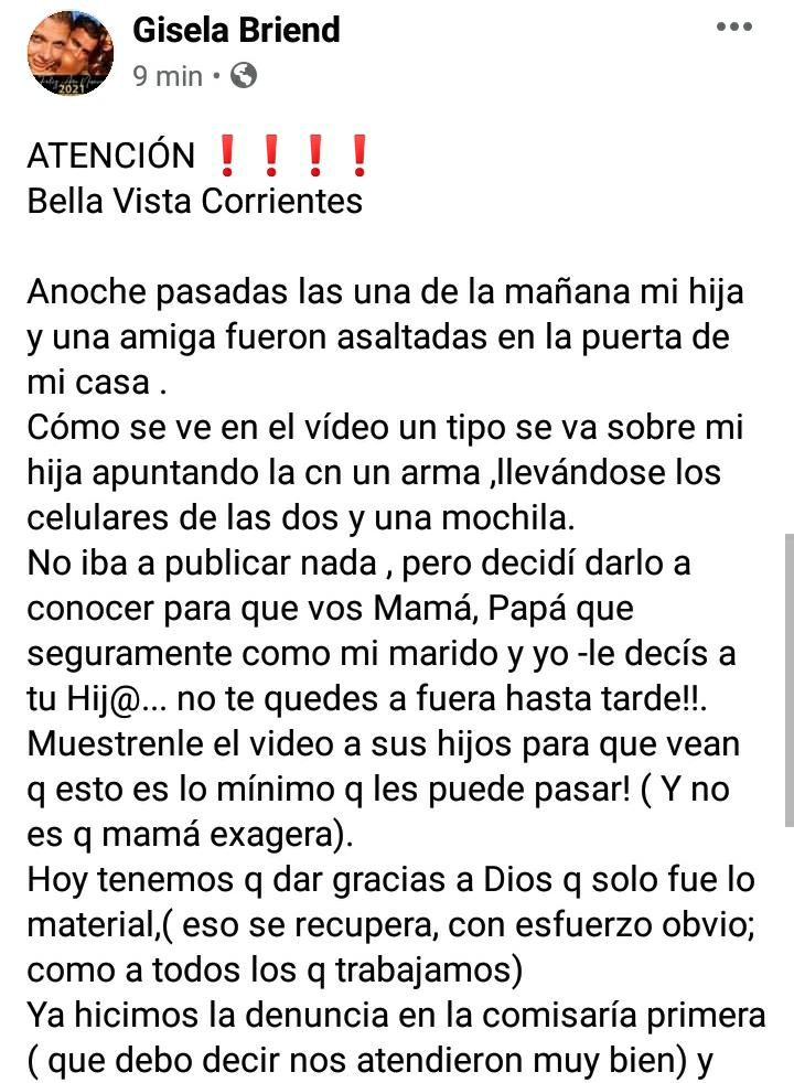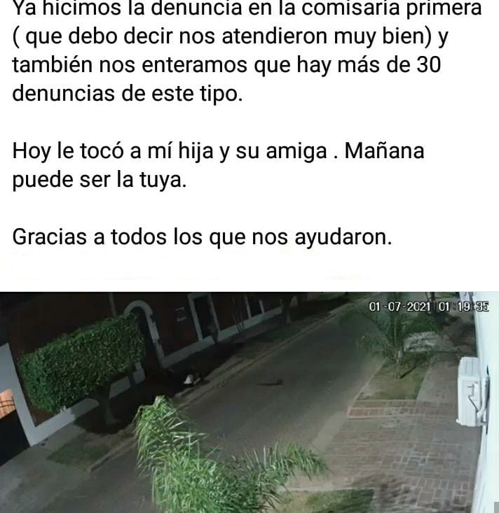 Se viralizó un video de una cámara de seguridad, donde se puede observar cómo se acerca un hombre a un grupo de chicas sentadas en la vereda. De pronto, se ve como se produce un ataque y posterior forcejeo. El hecho ocurrió a las una de la madrugada por calle Córdoba, cerca de un local muy conocido de la ciudad. Gisela Briend, publicó esta mañana un texto en su biografía de Facebook para concientizar sobre la estadía de jóvenes hasta altas horas de la noche en las veredas y la inseguridad que crece en la ciudad. «Mi hija sigue asustada y esto es un llamado para que todos los jóvenes hagan caso a sus padres cuando les dicen que no se queden hasta tarde en la calle», dijo en su declaración a LA MAÑANA DE LA RADIO.
